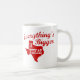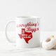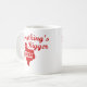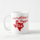 This coffee mug contains a red graphic and text in the shape of the state of Texas.