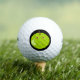 This awesome golf ball features a cartoon of an evil apple with red eyes and a scowl on its face. The apple has a scar on its cheek where someone has peeled it. This has made the apple very angry and it has set off into the black night to seek revenge.