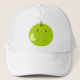 This awesome hat features a cartoon of an evil apple with red eyes and a scowl on its face. The apple has a scar on its cheek where someone has peeled it. This has made the apple very angry and it has set off into the black night to seek revenge.