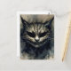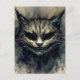 Postcard features feline watercolor artwork of a sinister looking cat in neutral and dark tones. The wicked cat is reminiscent of the mysterious smiling Cheshire cat from Lewis Caroll's classic masterpiece of children's literature, Alice's Adventures in Wonderland!