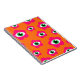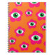 Notebook with a colourful retro cover: Pink flowers with evil eyes on their centres, with a vibrant orange background. Great gift for retro lovers!