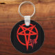 An inverted red pentagram on a black background with a smaller pentagram with evil written inside it.
