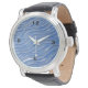 This unusual Men's watch features a blue water pattern. It's colours are shades of blue. The design conjures up the ocean or river. Perhaps it's for a sailor or a fisherman? The numbers are big to make it easy to read. Only you know if it's right for you. Look for the other products in this collection. Brought to you by Oregon Tile maker Fay Jones Day.