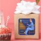 This personalised bookplate has a vintage stencil look. A woman in a blue dress sits at a writing desk with pen raised while a lamp shines next to her. The background is dark blue. The woman looks like she is from the 19th or early 20th century. The design has a modern Art Deco feel with squared lettering. The desk says, "Ex Libris," meaning "from the books / from the library of" in Latin.