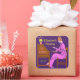 This personalised bookplate has a vintage stencil look. A woman in a pretty pink dress sits at a writing desk with pen raised while a lamp shines next to her. The background is dark purple. The woman looks like she is from the 19th or early 20th century. The design has a modern Art Deco feel with squared lettering. The desk says, "Ex Libris," meaning "from the books / from the library of" in Latin.