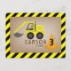 Construction theme birthday with illustration of a yellow excavator and orange cone with yellow and black border.