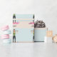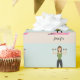 The wrapping paper features Destei's cartoon illustration of a brunette girl who is holding dumbbells in her hands. The girl is standing on a pink mat that has two dumbbells on it and a blue water bottle. Under the image there is a personalizable text area for a name.