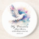 Sandstone round coaster with inspirational quote scripture depicts a beautiful white dove flying through the sky, its wings adorned with blue and lavender splashes of paint. It features an encouraging Bible Verse Exodus 33:14, “My Presence will go with you, and I will give you rest.”