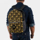 This fun backpack features a delightful boho style pattern of a playful gold giraffe. Included in the pattern with the giraffe are a butterfly and various floral elements, along with symbols. The pattern is placed on a dramatic black background. Your triple letter monogram is in gold within a black circle banner at the centre of the pocket.