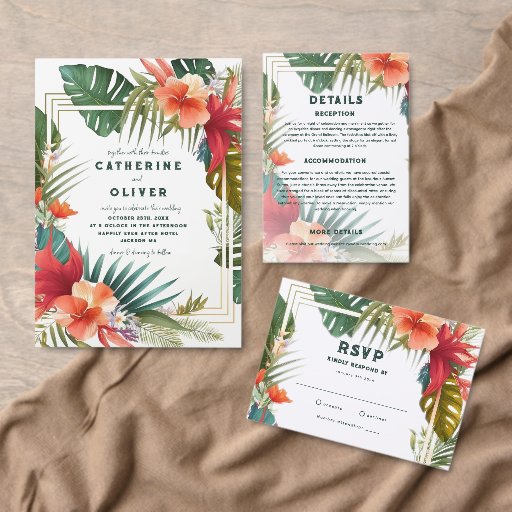 Invite your guests in style with this elegant tropical wedding invitation, perfect for beach and destination weddings. Featuring lush watercolor hibiscus, palm leaves, and Monstera foliage, this design captures the essence of a romantic island celebration. The modern script and bold serif fonts add a touch of sophistication, while the golden geometric accents frame your wedding details beautifully.