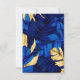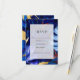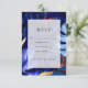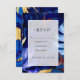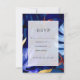 Wedding rsvp card featuring a luxurious jungle pattern in hues of blue, burgundy and gold.