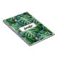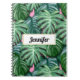 Personalised spiral notebook made with an image of big leafy lush green tropical leaves with a splash of pink behind. Painted with acrylics and digitised. A white frame with a faux gold foil border layered over top with your name written inside.
