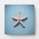 A picture of an exotic orange starfish with a dark blue background. Bright white light seems to shine upon it.