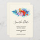 Party save the date card with vibrant and beautiful tropical flowers. Orchids, hibiscus and tropical leaves. Pink, turquoise, red and orange colours.
