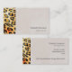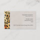 A business card with a border designed with an exotic wild cat animal print in watercolor. The background is tan.