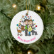 A stick figure expectant couple, two grey cats, and a brown dog in front of the decorated holiday tree with an area that reads "We're Expecting!" in pink. The ornament back has a red heart ring with text that you can customise with the current year Christmas!