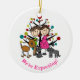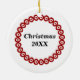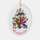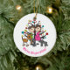 A stick figure expectant couple, two grey cats, and a brown dog in front of the decorated holiday tree with an area that reads "We're Expecting!" in pink. The ornament back has a red heart ring with text that you can customise with the current year Christmas!