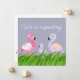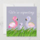Share your great news with this pretty Flamingo pregnancy announcement card. A delightful flat card to send to your family and friends to let them know you are expecting a baby. Design features watercolor pink and pale blue mammy, daddy and baby flamingos with a pale patterned purple background and white text, All text can be amended to customise then personalise with your due dates and message on the back . Oh - and many congratulations.