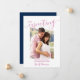 Custom photo pregnancy announcement in gender neutral pink and navy blue. The photo template is set up for you to add your own photo, which is displayed portrait format. "expecting" is lettered in elegant handwritten typography and the pregnancy announcement message is fully editable for you to customise with baby's due date and your names. A simple, modern minimalist design to share your wonderful news.