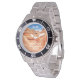 This stainless steel wrist watch, with it's unique photo face and stainless steel strap, is a great gift for a hiker. The watch face is an original photograph which shows the beauty of the striated rock formations in a remote desert location in Arizona called "the Wave". The orange and tan colours are nature's beautiful artwork. The striated patterns in the rocks were created thousands of years ago by erosion caused by wind and water. A hiker's paradise! Text is "Exploring New Heights at 70!" and a name, but you can easily modify it. There are also greeting cards and party invitations, and other gift items in this pattern. All Rights Reserved © 2013 Alan & Marcia Socolik.