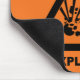 Orange mousepad with a black explosive hazard symbol.