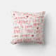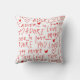 This pillow contains a playful pattern of handwritten words like "LOVE," "ADORE," and "FOREVER," mixed with heart shapes, all in red ink on a white background. The overlapping and random arrangement of these elements creates a dense and visually engaging design. This pattern is perfect for conveying themes of love and affection