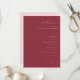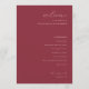 This elegant wedding program features a sophisticated maroon color palette, exuding an air of timeless romance and refinement. The clean, modern typography adds a touch of contemporary elegance to the classic design, making it perfect for a formal or semi-formal celebration. With its simple yet stylish layout, this program is ideal for capturing the essence of your special day, ensuring that every detail feels both personal and polished. Its customizable text areas allow you to tailor it to reflect your unique story, creating a memorable keepsake for guests to cherish.