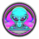 Neon psychedelic art depicting an alien and flying saucer. Generative content.