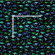 Tiny hand painted dinosaurs of all sorts in emerald green, aqua, cobalt blue, turquoise, teal, mint and purple on a plain black background.