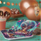 Funny extraterrestrial alien being eating birthday cake with a balloons background birthday party paper plates.