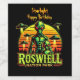 Three distinct aliens with green skin and large red eyes stand prominently, illuminated by a dramatic sunset behind them. In the backdrop, flying saucers hover above a forest, contributing to the otherworldly atmosphere of Roswell Nation Park.