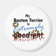 My Boston Terrier is Extremely NAUGHTY! Obedient is crossed out, and naughty written in. Funny Boston Terrier gifts that dog lovers will find hilarious! The design also features mud splatters (with a silhouette inside), paw prints, and bite marks out of the word obedient.