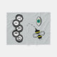 An artistic face with a clever twist. This design uses a bee In place of an eye to create "Eye Bee" (I be). A trail behind the bee forms a nose and a set of 5 tires forms the mouth (Tired). The background is grey and the tires have the letters in them for the word tired.