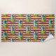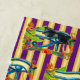 A beach towel decorated with the protecting Eye of Horus on royal gold and purples stripes. Sunbathe in peace and safety under the potent good luck talisman of the ancient Egytpians.