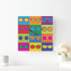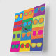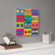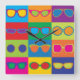 Pop-Art styled illustration of popular eyeglass frame styles in a colourful chequerboard.