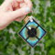 Eye Through Window © Sunny Mars Designs. This cool and unique premium small square keychain or keyring features a graphic illustration design of a striking bright blue eye iris looking through a window with a black frame.
