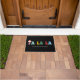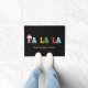 Colourful, festive, typographic "FA LA LA" santa hat, black, holiday door mat. Customise with your family signature.