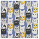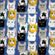 Cat faces. Six separate faces. A grey cat, a black one, an orange one, two white ones, and a white with black muzzle. colour of eyes range from blue to green. Background is a muted medium blue.