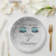 Celebrate the fiftieth birthday milestone with this elegant and glamourous black and aqua birthday round paper plates. Adorned with aqua glittered eyes and diamond sparkles. Personalise it with a name. Created by Simply Farmhouse Press on Zazzle.