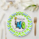 Fabulous at 40 40th birthday paper plates, a great addition to the 40th birthday celebration, features a blonde haired lady in a black dress and green boots, black, blue, and lime green text that reads Fabulous at 40, an area you can customise with your special message or thank you note, and a green decorative ring and chevron stripe rim of blue, green, and white!