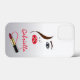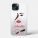 © Sunny Mars Designs. Face & Lipstick Make Up Artist Cell Phone Cases – Trendy chic girly hair and beauty makeup cosmetics stylish modern feminine custom Case-Mate cover with woman's face, full lips, blue eyes, brown hair and name in lipstick. Personalise it by adding your own name or other text to it. Perfect gift for makeup artists, beauticians or cosmetologists.
