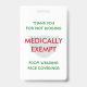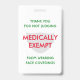 Stylish white MEDICALLY EXEMPT Badge, showing MEDICALLY EXEMPT in red text on a pale grey face mask. The red and green text reads THANK YOU FOR NOT JUDGING, MEDICALLY EXEMPT FROM WEARING FACE COVERINGS. This text is CUSTOMIZABLE so you can replace with your reason for exemption (eg. autism, asthma, hidden disability, etc) or you can add your name, if desired. The background is WHITE. This makes a great response to all the judgmental stares and is a good way to show that social distancing is required.