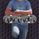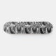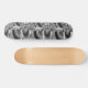 This awesome skateboard features a black and white pattern that can resemble many shapes and forms but the whole image looks like an evil face with dark staring eyes and a wide grin.