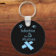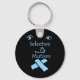 A Selective Mutism awareness keychain featuring a face with wide eyes and tape over the mouth.