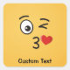 A kissing emoticon. One eye is open, the other is winking. A heart is shown leaving the kissing mouth. Custom text.