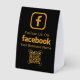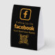 Encourage customers to connect with your brand on social media with this eye-catching Facebook table tent sign. Featuring the iconic Facebook 'f' logo and a scannable QR code, this sign makes it effortless for patrons to follow your business page. The bold black background with vibrant orange text ensures high visibility, while the customizable space for your business name adds a personal touch. Perfect for restaurants, cafes, bars, and retail stores, this table tent sign is a simple yet effective way to boost your social media engagement and build a stronger online community. Make it easy for customers to find and follow you!