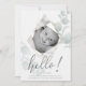 Birth Announcement | OnTrend  diamond shape faceted photo frame for your baby's photo, in Alabaster White surrounded by watercolor  eucalyptus leaves - ' hello! ' in hand written calligraphy with minimal baby details and name at bottom.  Trendy Stylish and  Modern.