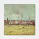 Factories at Asnières, Seen from the Quai de Clichy by Vincent van Gogh is a vintage fine art post impressionism architectural painting featuring a row of factory buildings with smoke from the chimney stacks polluting the environment in Asnières, France.