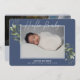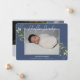 An elegant way to introduce your new baby boy. Featuring faded greenery and eucalyptus branches over a modern blue background. Personalise with 3 of your favourite baby pictures, baby name, stats and an extra message in the back for your family and friends.