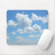 A picture of the blue sky with puffy clouds. The blue sky fads from like a cornflower blue to a light blue.